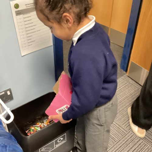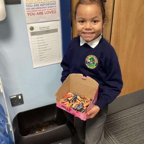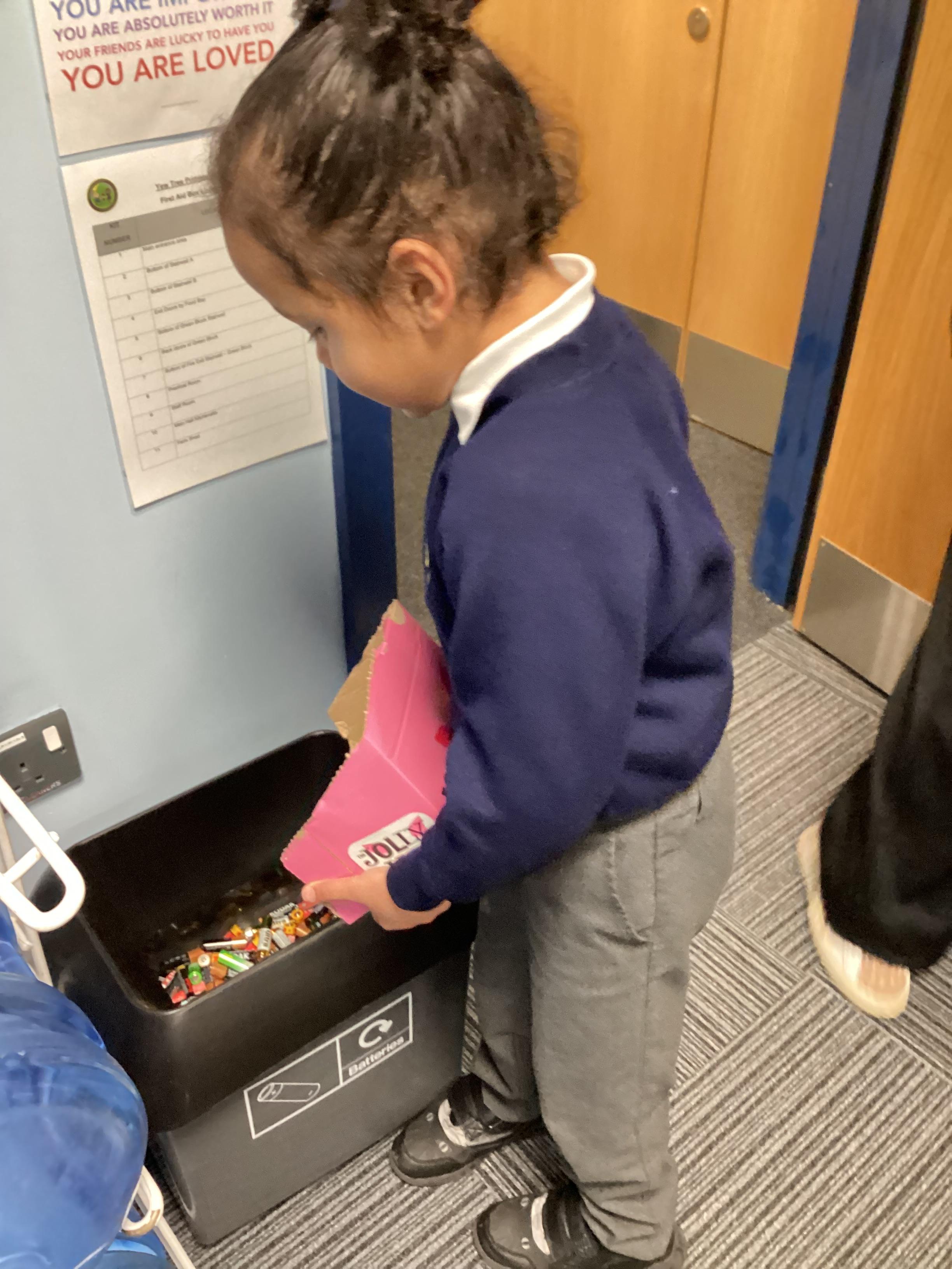 One of Eco Councillors brought old batteries from home into school to recycle.