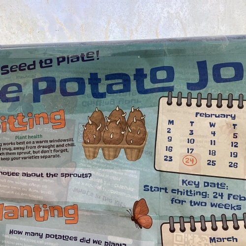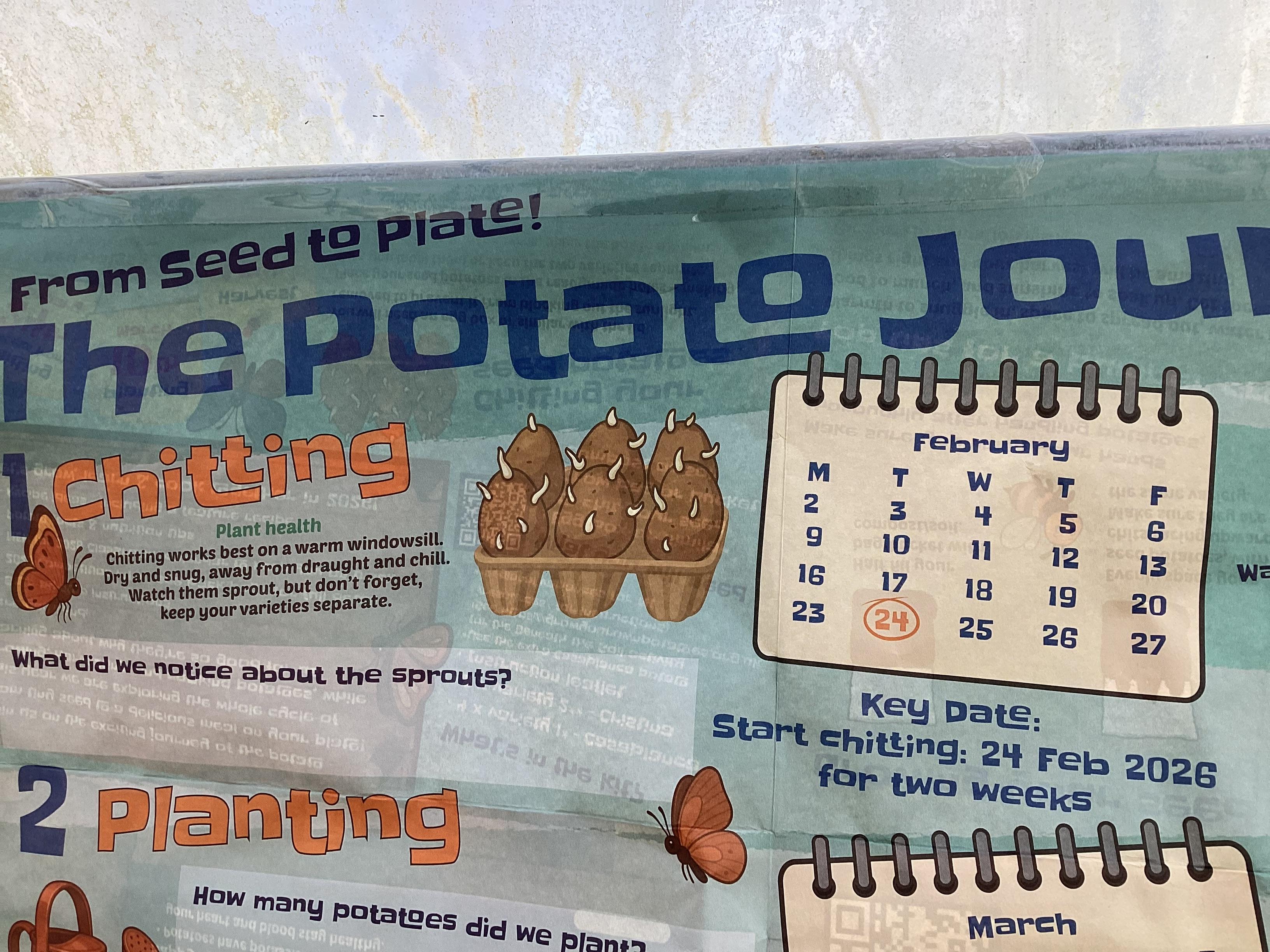 First we need to "chit" the potatoes. This means the potatoes will start to sprout ready planting in two weeks.  Pop back and watch our potato journey!