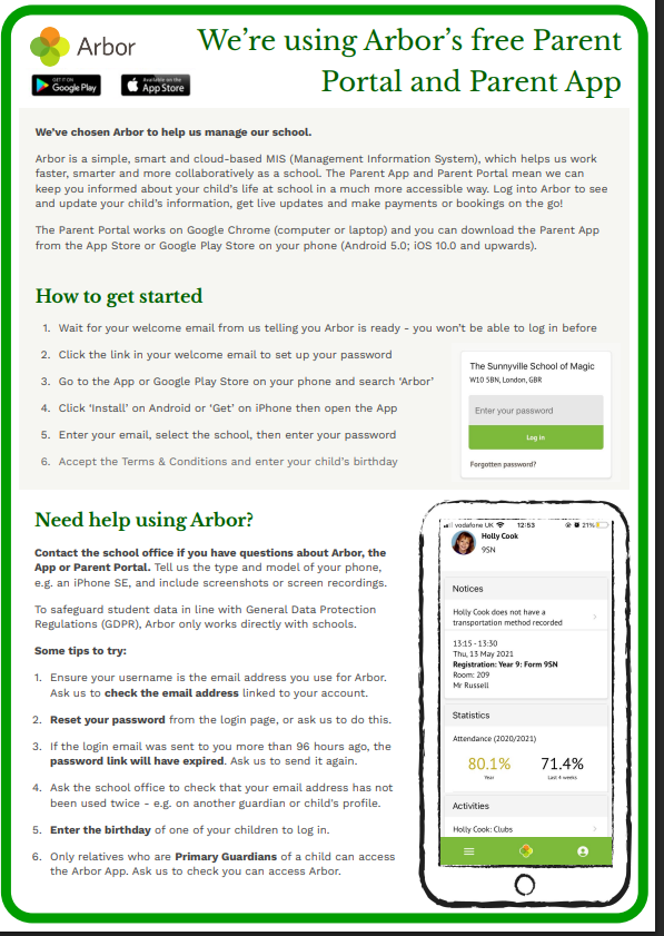 More information can be found here: Getting started - Log into the Parent Portal and the Arbor App – Arbor Help Centre (arbor-education.com)